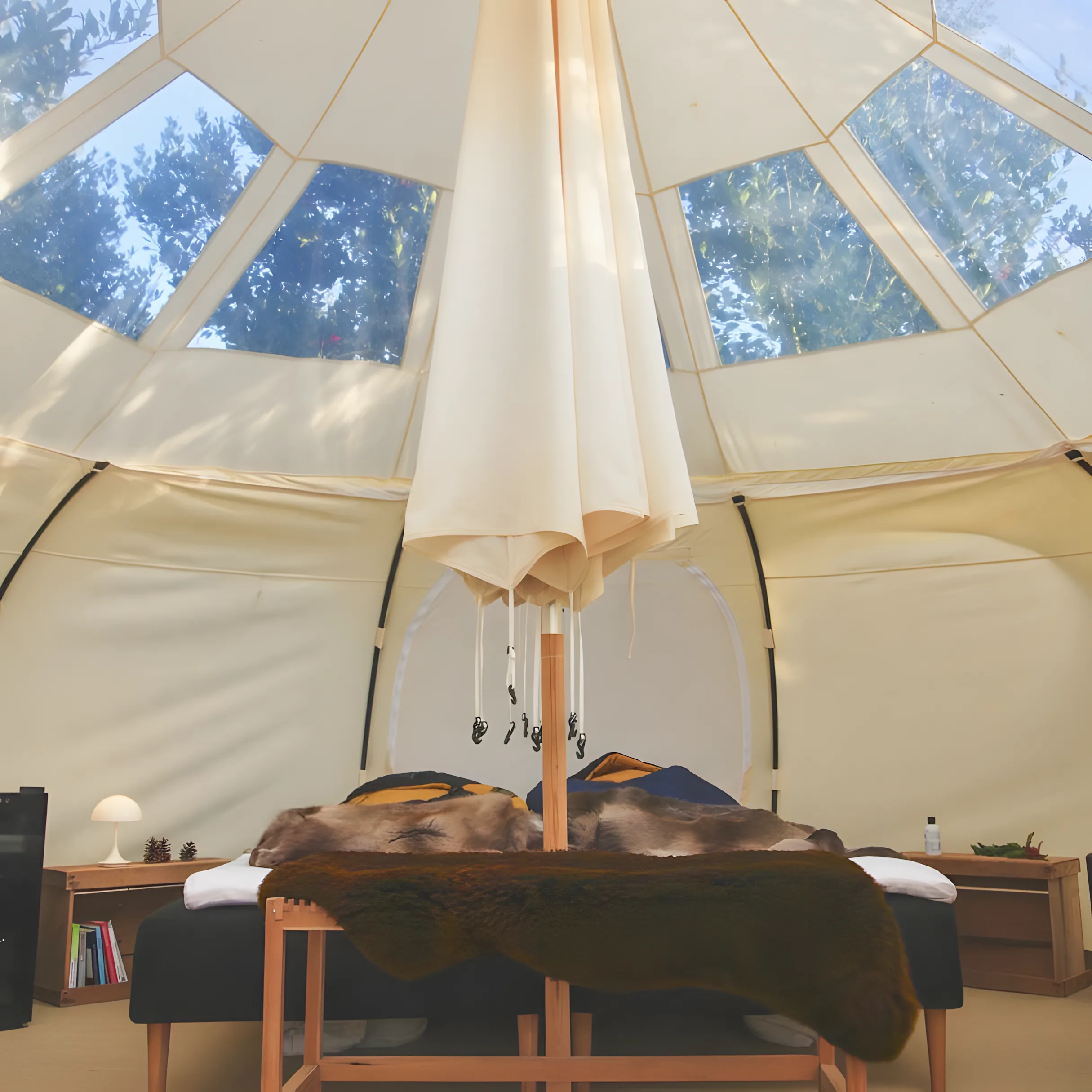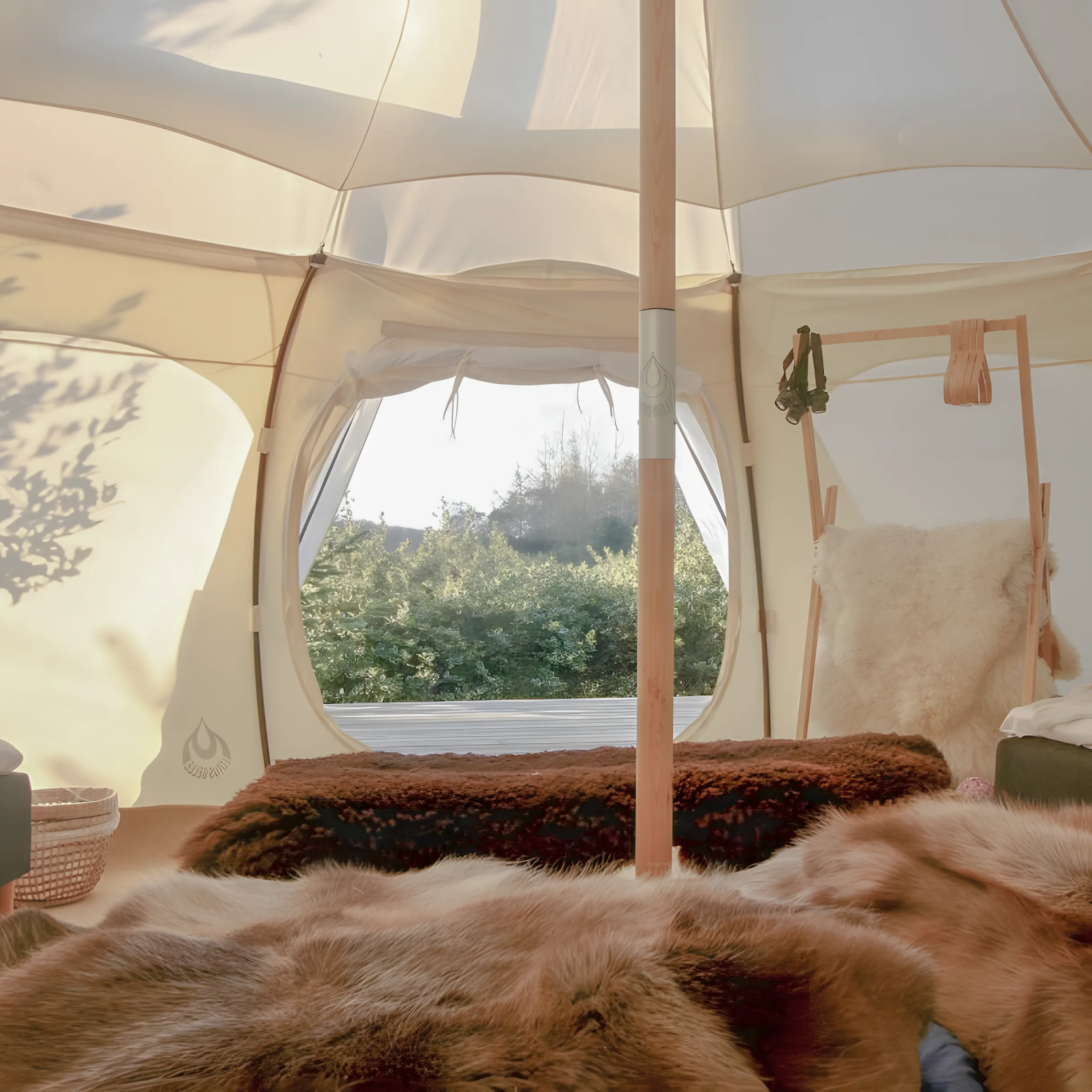 Oplev glamping i eksklusive Lotus Belle-telte, smukt placeret ved alpakafolden. Her bor I midt i naturen – med alpakaerne som nærmeste nabo – uden at gå på kompromis med komfort.